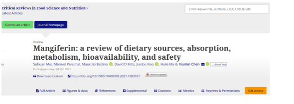 Professor Chen Xiumin from the School of Food and Bioengineering, Jiangsu University, published an online article entitled "Mangiferin: a review of dietary sources, absorption, metabolism, bioavailability, and safety" in Critical Reviews in Food Science and Nutrition (IF 11.176), a top peer-reviewed journal in the field of food science and technology (//doi.org/10.1080/10408398.2021.1983767). This review paper introduced the recent progress in the absorption and metabolism of mangiferin, the latest methods to improve the solubility and bioavailability of mangiferin, the influencing factors that affect the content of mangiferin in foods, and the new patented technologies for improving the bioavailability of mangiferin using nanotechnology. This paper has been advertised by the public account of "Food Plus Smart Food Technology" (). The first author of this article is Mei Suhuan, a doctoral candidate (2019) in the School of Food and Bioengineering, Jiangsu University. Professor Chen Xiumin is the only corresponding author of this article. Postdoctoral fellow Manivel Perumal and Professors Maurizio Battino, David D Kitts, Xiao Jianbo and Ma Haile are the co-authors.