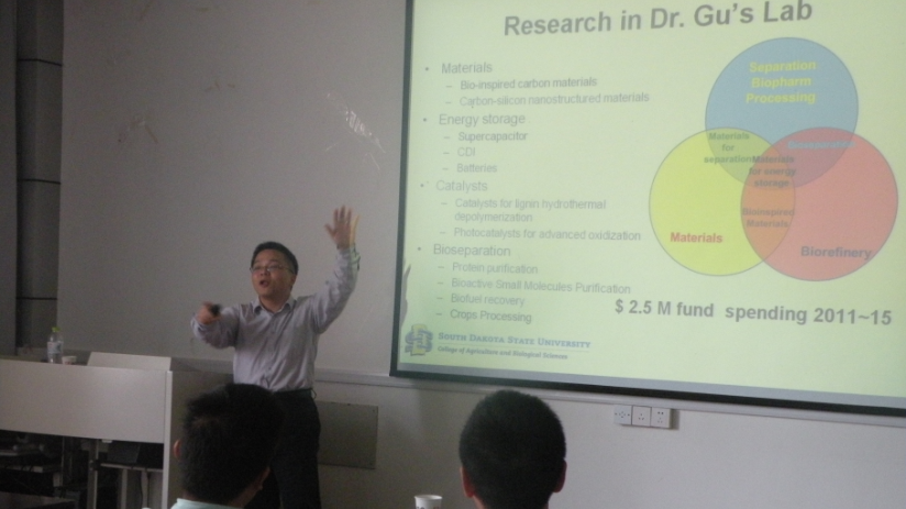 On May. 19, Gu Zhengrong from Agricultural and Biosystem Engineering Dept., South Dakota State University, visited Jiangsu University. Ma Haile, the dean of School of Food and Biological Engineering, introduced Dr. Gu Zhengrong. Assoicate Prof. Gu Zhengrong delivered an academic lecture named Biorenewable Graphene and Biorefinery .