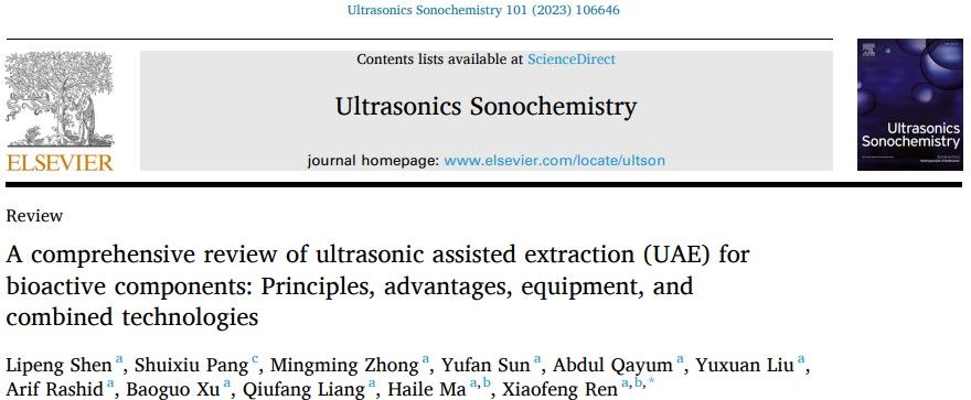 任晓锋教授课题组在国际声学顶级期刊《Ultrasonics Sonochemistry》(Q1,IF=8.4)在线发表了标题为 “A comprehensive review of ultrasonic assisted extraction (UAE) for bioactive components: Principles, advantages, equipment, and combined technologies”的综述性论文 (DOI: 10.1016/j.ultsonch.2023.106646)。AV片