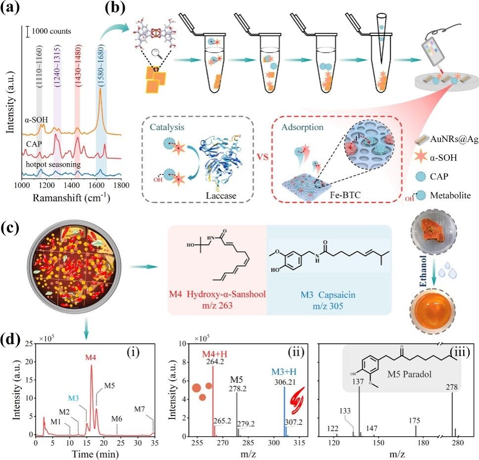 火锅底料成分复杂,其中辣味物质对羟基山椒素的SERS信号产生严重干扰,制约了SERS技术在该食品体系下的应用。该研究首先运用模拟计算揭示了火锅底料中辣椒素(CAP)对α-SOH拉曼信号的干扰机理,依此提出了两种解决CAP干扰的前处理方案,即漆酶催化转化和金属-有机骨架(MOF)处理(图2),进一步比较两种方案对α-SOH SERS信号抗干扰的效果,结果表明Fe-BTC MOF表现出显著的抗CAP干扰作用。