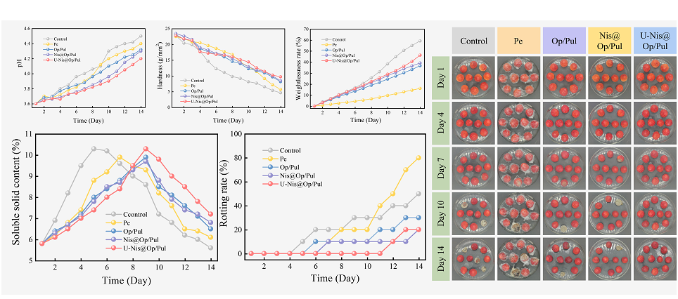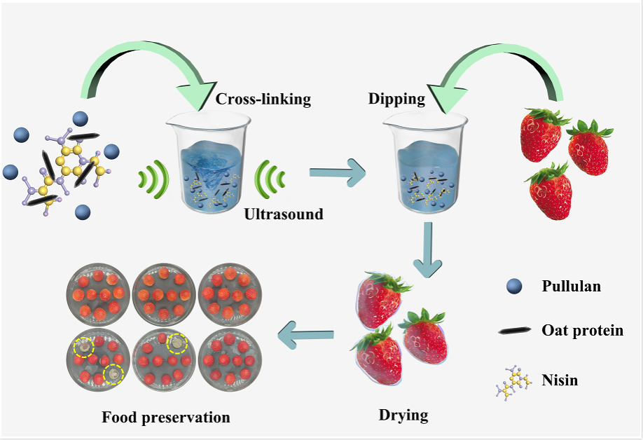 燕麦蛋白具有良好的成膜性及天然可降解性,但是纯燕麦蛋白膜存在机械性能较差的缺点,限制了其在食品包装材料的应用;本研究在燕麦蛋白中加入普鲁兰多糖制备蛋白质-多糖复合膜,改善蛋白膜的机械性能和阻隔性能,同时添加天然抗菌剂乳酸链球菌素(Nisin)赋予复合膜抑菌性能。应用课题组开发的多模式超声波处理技术制备复合膜,利用超声波的空化效应增强分子间氢键相互作用,进一步提高了复合膜的机械性能和阻隔性能。研究发现:与对照组相比,超声波处理显著提高了负载Nisin的复合膜的断裂伸长率(18.37%)和透明度(8.03%),复合膜的总可溶物质量和氧气透过率分别降低了8.33%和2.78%。用于草莓的保鲜试验结果表明,其可以延缓草莓的成熟和衰老,延长其货架期。