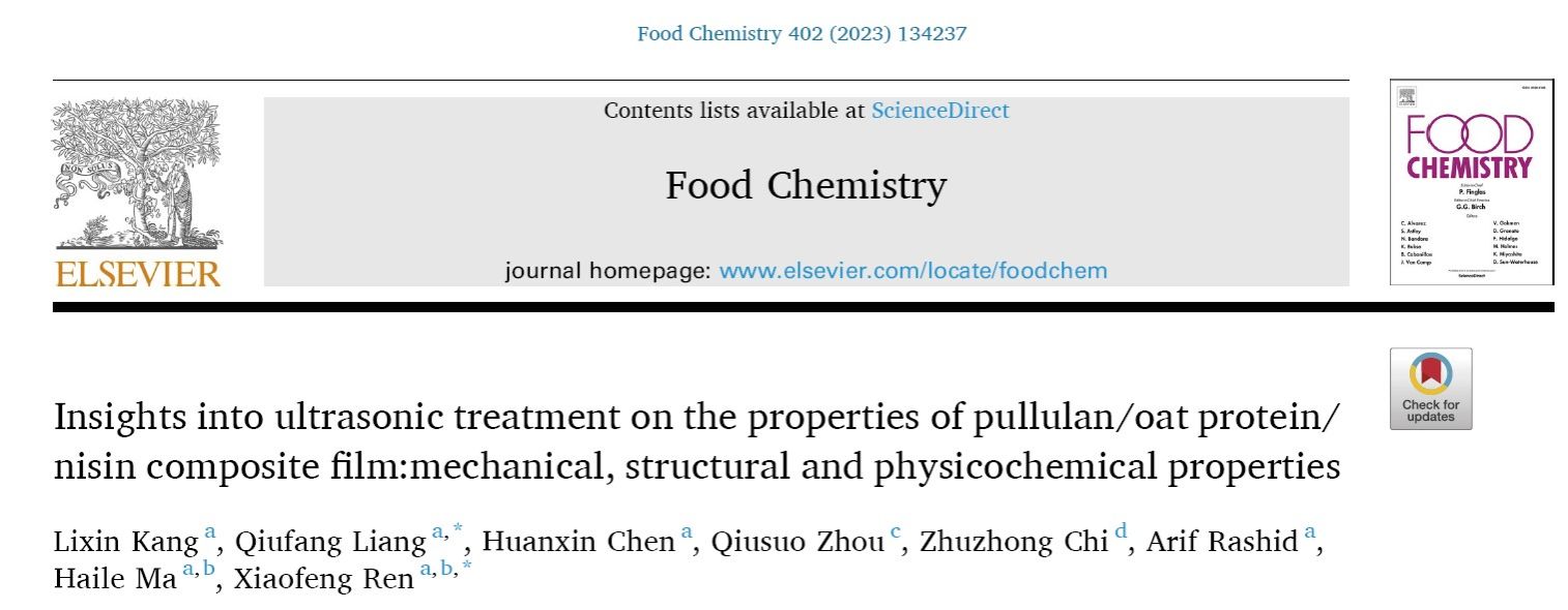 任晓锋教授在Food Chemistry (Q1)期刊上发表了题为“Insights into ultrasonic treatment on the properties of pullulan/oat protein/nisin composite film:mechanical, structural and physicochemical properties”的研究论文。2020级硕士研究生亢利鑫为论文第一作者,任晓锋教授和梁秋芳博士为论文共同通讯作者。