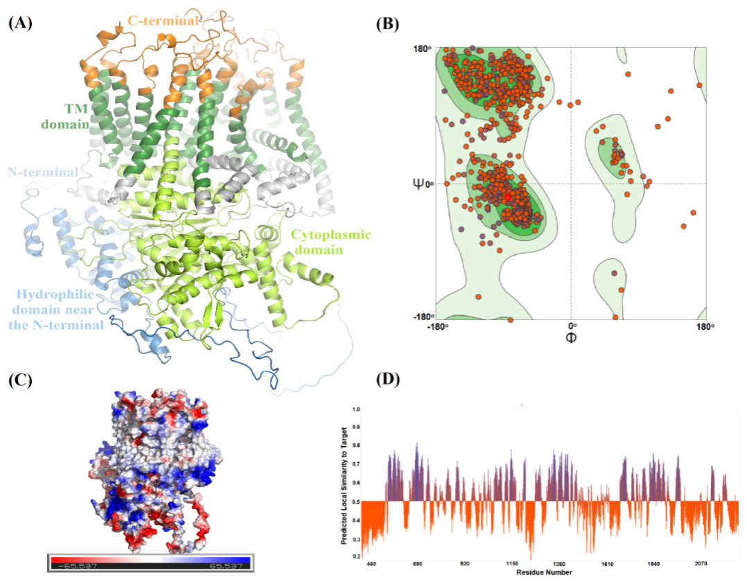 针对以上问题,该研究以蛹虫草为研究对象,来进一步明确蛹虫草中β-1,3-葡聚糖合成酶的催化特性和结构基础。首先,克隆、鉴定和重新注释了编码β-1,3-葡聚糖合酶的基因CMGLS,得到准确氨基酸序列后对其进行生物信息学分析。其次,采用产物包埋纯化法从蛹虫草发酵菌丝体中得到了部分纯化的CMGLS,并异源表达了葡聚糖合成酶的中心亲水结构域CMGLS-CHCD对比分析其催化特性。最后,通过AlphaFold首次预测了β-1,3-葡聚糖合成酶的三维(3D)结构(图1),并在此基础上,利用分子对接来阐明其潜在催化机制。结果表明底物UDP-葡萄糖通过氢键、π-π堆积、盐桥和疏水作用力与CMGLS中至少11个氨基酸残基结合,Arg1436被预测为直接与葡萄糖、磷酸和UDP-葡萄糖上的核糖环相互作用的关键氨基酸(图2)。这些发现将为认识和理解真菌葡聚糖合成酶催化合成葡聚糖的过程和机理提供了一定的研究基础和技术参考。