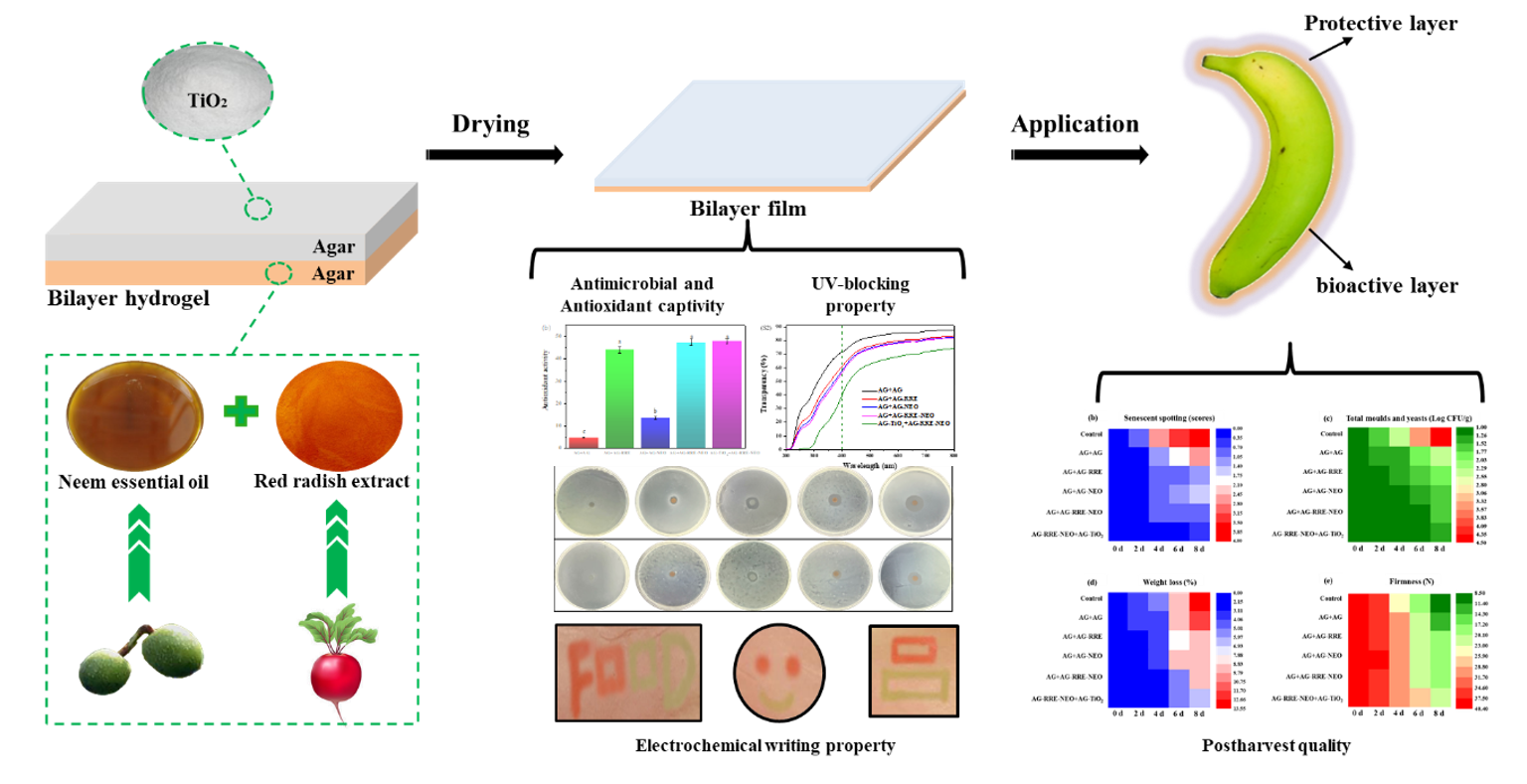 邹小波教授课题组在食品领域国际权威期刊《Food Hydrocolloids》在线发表了我院邹小波教授课题组题为“Agar/TiO2/radish anthocyanin/neem essential oil bionanocomposite bilayer films with improved bioactive capability and electrochemical writing property for banana preservation”的最新研究成果。该研究开发了一种带有绿色标签的缓释型双层薄膜体系,有效的改善了香蕉的贮藏品质。2020级博士生杨志坤、硕士生导师翟晓东为论文共同第一作者,邹小波教授为通讯作者。
