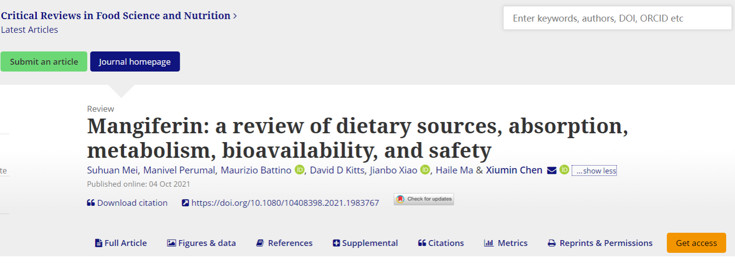 陈秀敏教授在国际食品领域顶级期刊Critical Reviews in Food Science and Nutrition在线发表题为“Mangiferin: a review of dietary sources, absorption, metabolism, bioavailability, and safety”的综述(//doi.org/10.1080/10408398.2021.1983767),介绍了近年来芒果苷在吸收代谢方面的研究进展以及提高芒果苷溶解度和生物利用度的最新方法,讨论了影响芒果苷在食品中含量的因素以及利用纳米技术和联合用药等提高芒果苷生物利用度等新型生物专利技术。该成果已被《食品加 智食科技》公众号(//mp.weixin.qq.com/s/nS363_2xdfajF5kKH9GAdA)推送,产生了较大的学术影响。本文的第一作者为AV片