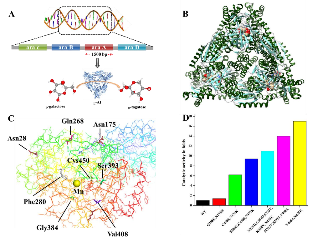 D-塔格糖(D-tagatose)是一种功能性稀有糖,其甜度与蔗糖相似,但热量却不到蔗糖的三分之一,是一种新型的低热量功能性甜味剂。D-塔格糖具有改善肠道菌群、抗龋齿、预防肥胖等生理功能,在食品、医药等领域应用潜力巨大。微生物法制备D-塔格糖因环境友好、催化效率高、条件温和、副产物少等优点备受关注,但微生物法也受到底物成本、转化效率、关键酶性质等因素的影响,从而制约着D-塔格糖生物合成的工业化进程。齐向辉教授课题组针对以上问题,围绕D-塔格糖高产菌株的分离鉴定、新型关键酶的发掘与设计、工程菌株的途径工程改造、酶的固定化、以及廉价底物的D-塔格糖生物制造工艺等方面开展了相关工作,并取得了一系列的研究成果。该文结合齐向辉教授课题组的前期研究成果,对D-塔格糖的功能、应用、制备工艺、工业化瓶颈、商业化前景等进行了综述;重点围绕D-塔格糖的微生物生物制造方法,关键酶-L-阿拉伯糖异构酶的理性、半理性和非理性工程化改造,可再生资源及副产物的高值化与D-塔格糖产量的提升策略,以及工业化过程中遇到的问题与对策进行了针对性的论述。该文可为D-塔格糖的微生物法工业化制造提供有益参考。