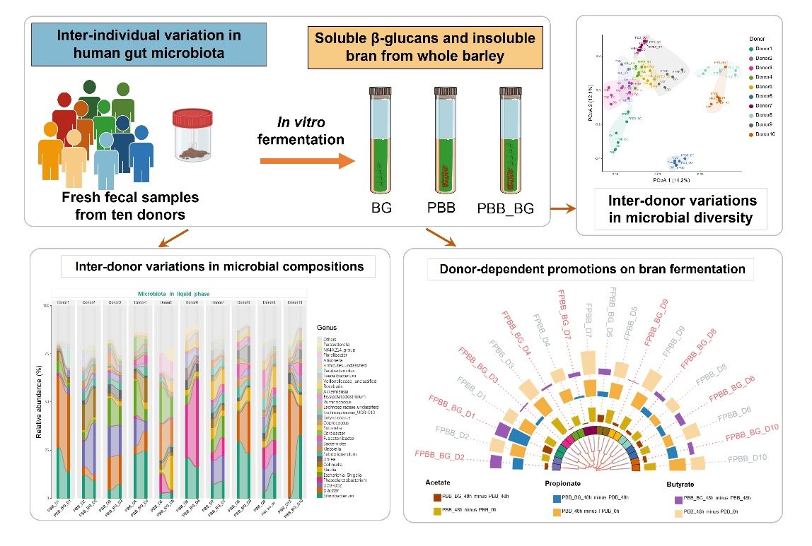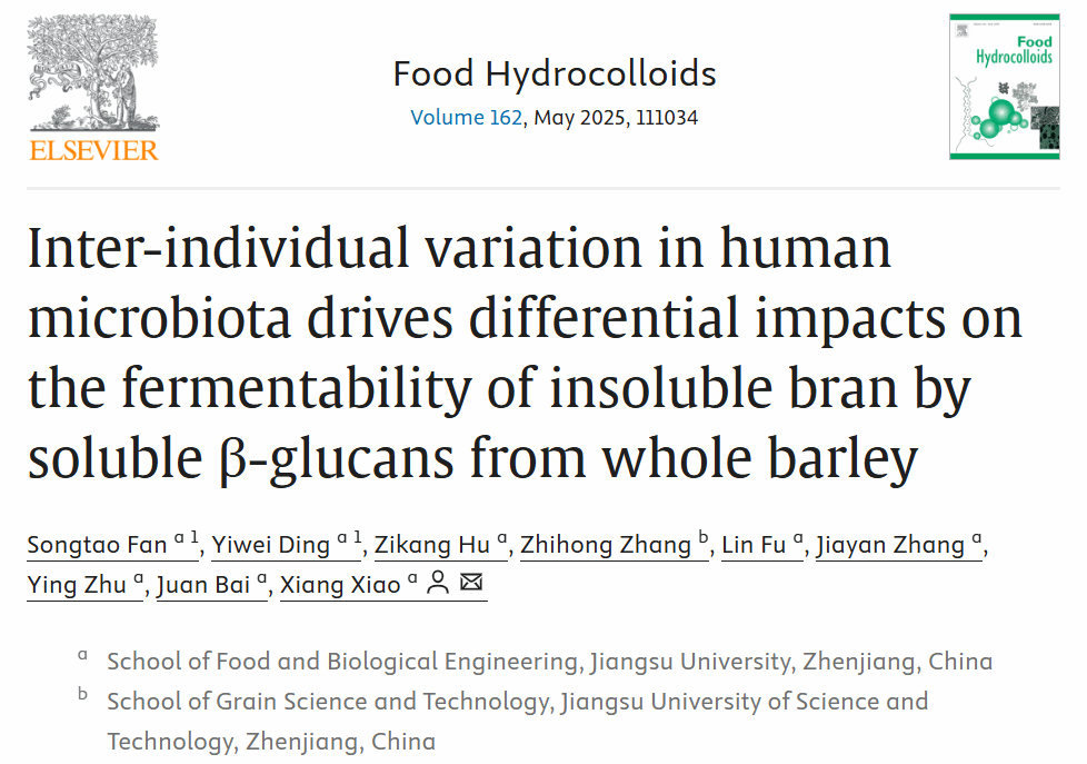 近日,我院肖香教授、范松涛讲师在在国际Top期刊《Food Hydrocolloids》(Q1,IF2023:11.0)上发表论文“Inter-individual variation in human microbiota drives differential impacts on the fermentability of insoluble bran by soluble β-glucans from whole barley”。AV片