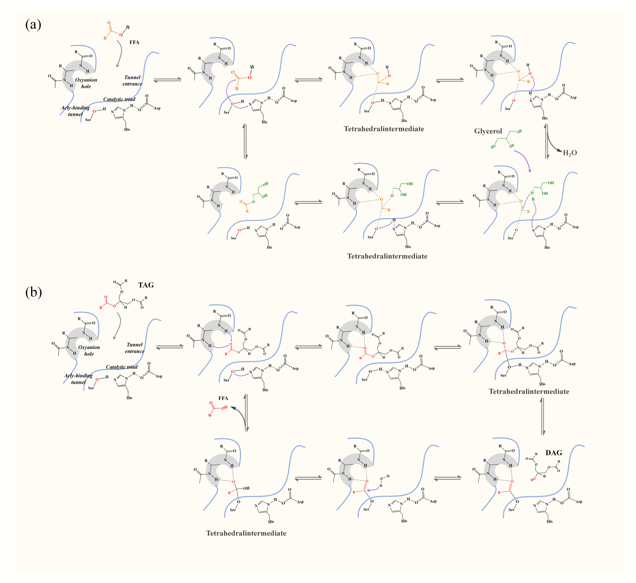 图2微生物脂肪酶直接酯化 FFAs 和甘油(a)以及选择性水解甘油三酯/食用油(b)合成甘油二酯的主要催化步骤和可能机制