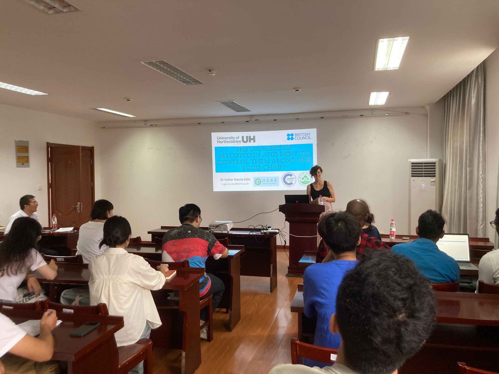 Carol Verheecke-Vaessen博士针对不同真菌毒素的产生途径和污染农产品的方式,着重介绍了利用温室模拟气候变化、建立谷仓模拟储藏环境这两个关键因素,从而构建预测真菌毒素的风险评估机制的相关研究成果。Maria Esther Garcia-Cela博士针对真菌及其产生的真菌毒素对农作物以及食品的污染现状,着重介绍了物理、化学和生物法控制真菌毒素的相关研究成果。Carol Verheecke-Vaessen博士和Maria Esther Garcia-Cela博士的报告内容丰富,深入浅出,热情洋溢,引人入胜。报告结束后,两位博士与参会师生进行了气氛热烈的讨论。